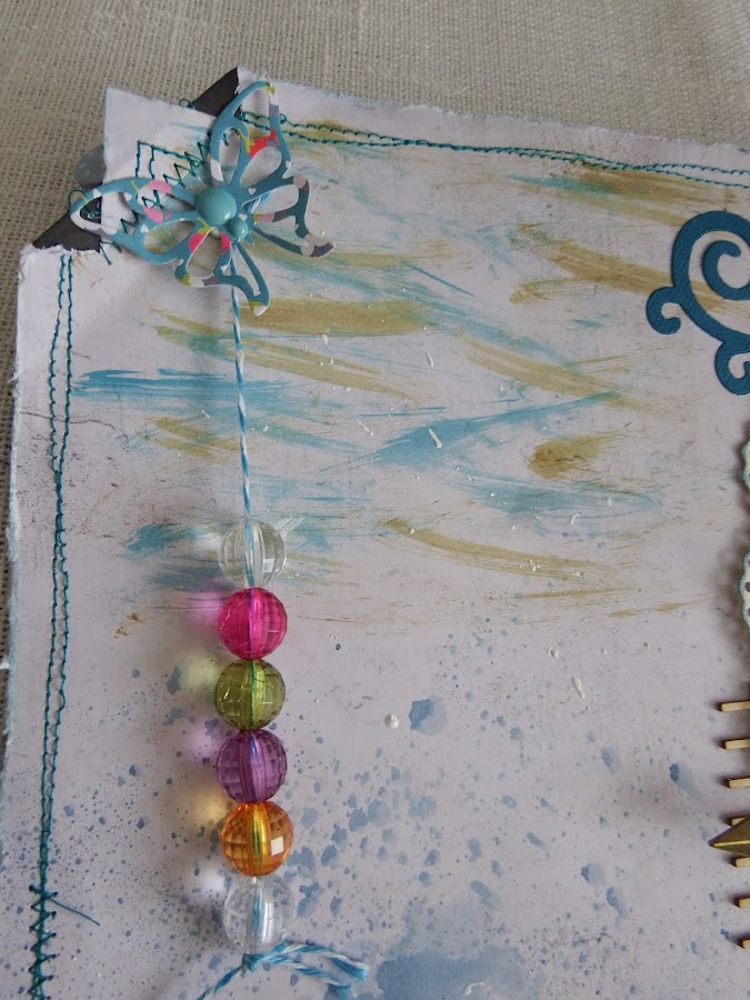 Amb un stencil i pasta Nubbo hi vaig fer unes fulles amb relleu. També uns cosits a tot el voltant i una papallona amb un penjoll de diferents boles de colors. Un cop vaig tenir la composició feta vaig esquitxar-ho amb gesso diluit amb aigua.
