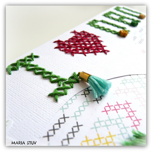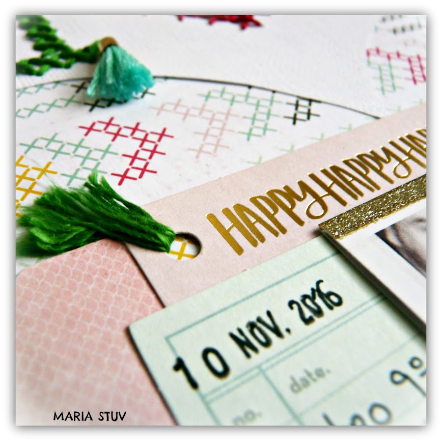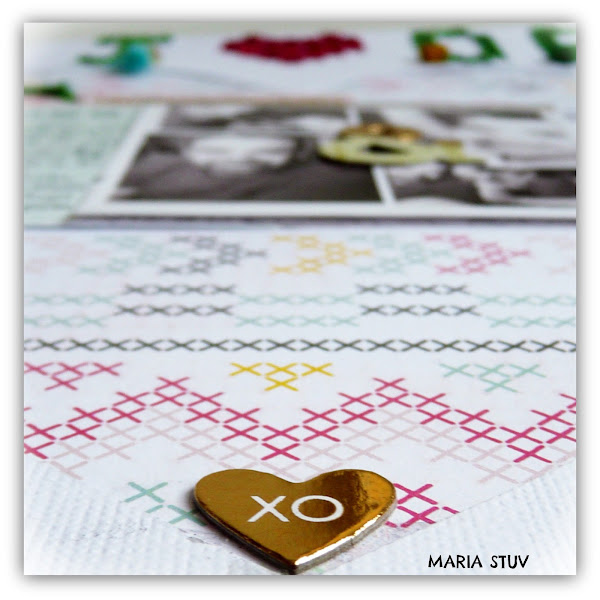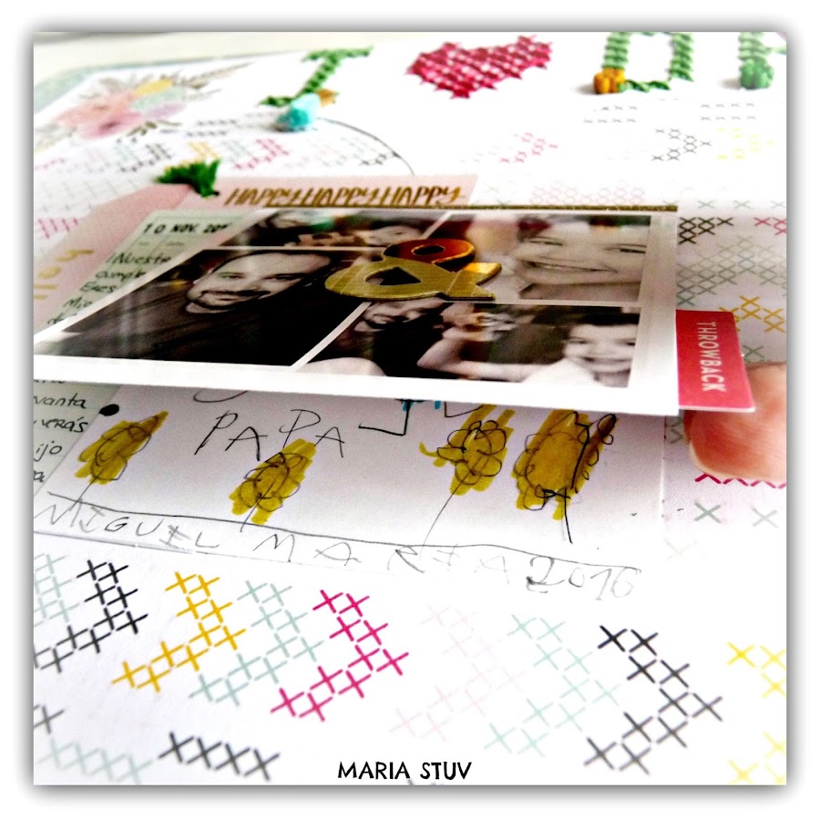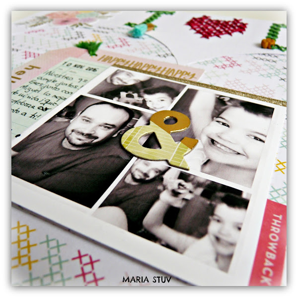He disfrutado muchísimo creando este Layout y le he dedicado sus horitas porque coser a mano y punto de cruz todas las letras gigantes de la parte superior y el corazón llevaron su tiempo... pero estoy muy feliz con el resultado... sobre todo, mi hijo que le encanta ver su colaboración... ah! claro, que vosotras diréis ¿En que ha colaborado él? Pues es que este Layout tiene una parte de flip flop escondida. Mirad las siguientes fotos y leed las leyendas de las mismas