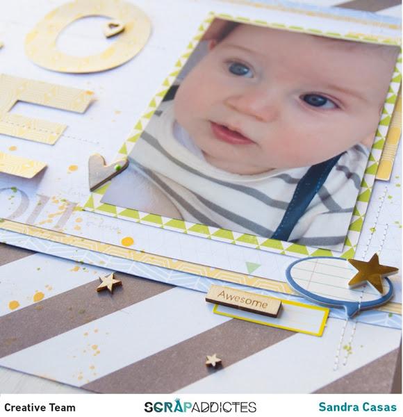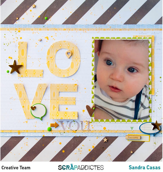 Tenía muchas ganas de hacer una lámina cuyo protagonista fuera Mateo, un bebé al que quiero mucho, del que soy madrina (que ilu!) y que aunque estemos un poquito lejos siempre llevo cerquita. Así que aprovechando el reto del mes de febrero en Scrapaddictes "Títulos grandes" scrapee esa fotaza robada de mi amiguisima Rebe para hacer este trabajo.