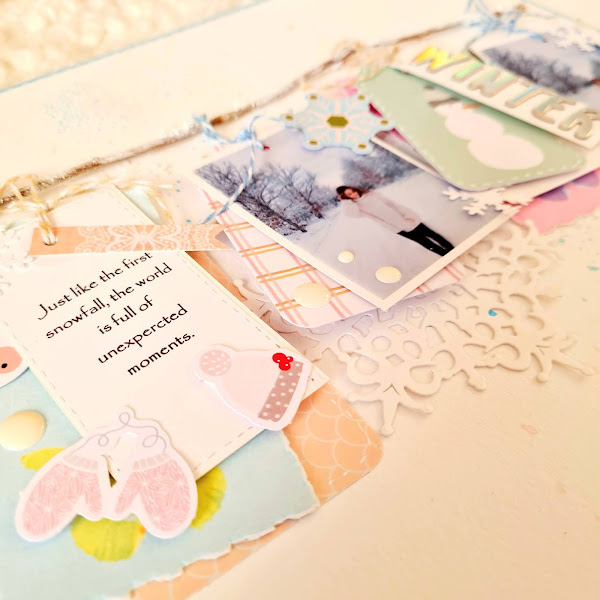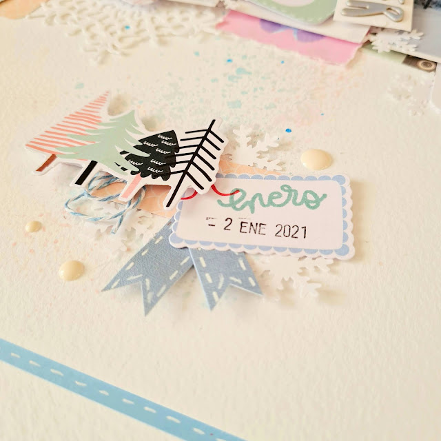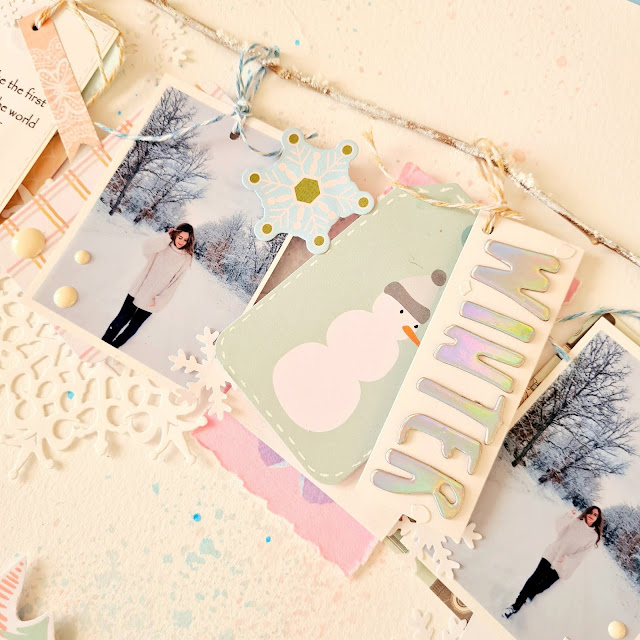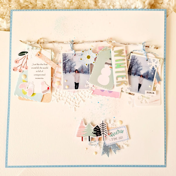 Usé de base papel de acuarelas con algunas manchas de color, pocas porque quería que quedara muy límpio. Coloqué un palo, al que le puse previamente pasta que imita nieve, de forma horizontal en el tercio superior del papel y de él fui colgando las fotos y todos los elementos decorativos.
