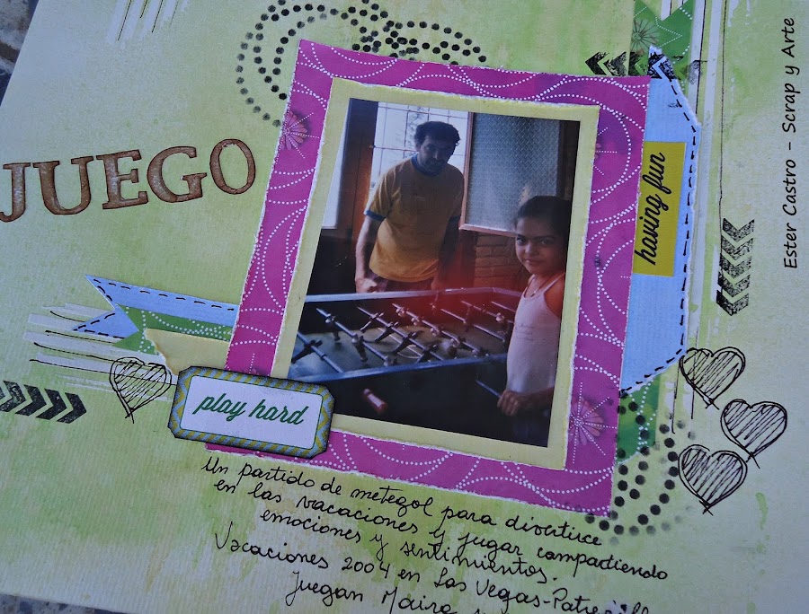 Una vez listo esto arme la composición de mi Layout pegando el mat con la foto, los banderines en los laterales y agregue corazones dibujados con el stencil, líneas y pespuntes con micofibra negra.
