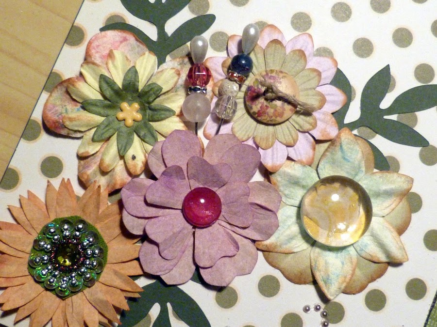 Y para finalizar, el bouquet de flores, algunas de Prima y un par hechas por mi, la de la esquina inferior izquierda lleva un centro de flores precioso de la tienda de Maria. Un par de alfileres terminan de adornar el conjunto.