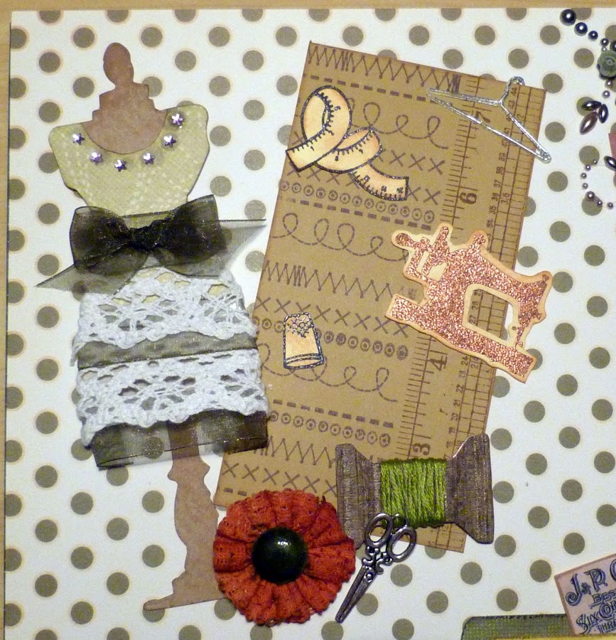 como veis he vuelto a usar el troquel Sewing room de Tim Holtz, esta vez con un vestido de puntilla y cinta de organza.
