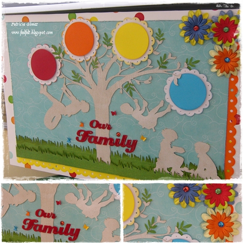 El arbol está usado como simbología a las ramas de la familia, los brotes verdes, la nueva vida.Todas las siluetas están tintadas en color banco con colorbox y embosadas con polvos transparentes.