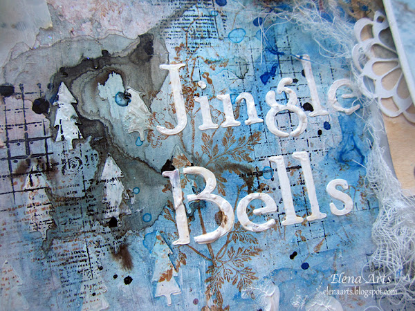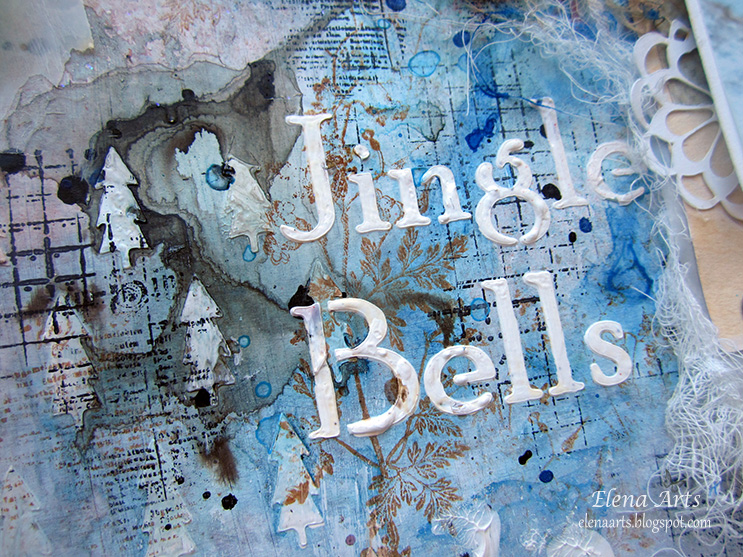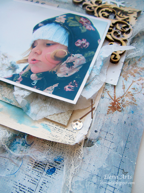 La gama de colores fríos predomina en este proyecto. Para darle un efecto aún más frío hasta llegar a congelado jejeje he puesto unas lentejuelas plateadas y papel de seda para imitar la escarcha.