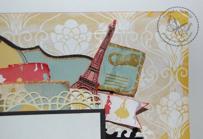 Layout enmarcadoComo ya he comentado, los papeles son de la colección Welcome to Paris de prima Marketing, distressados y entintados con varias tintas Distress Ink; Tea Dye y Fired Brick.
