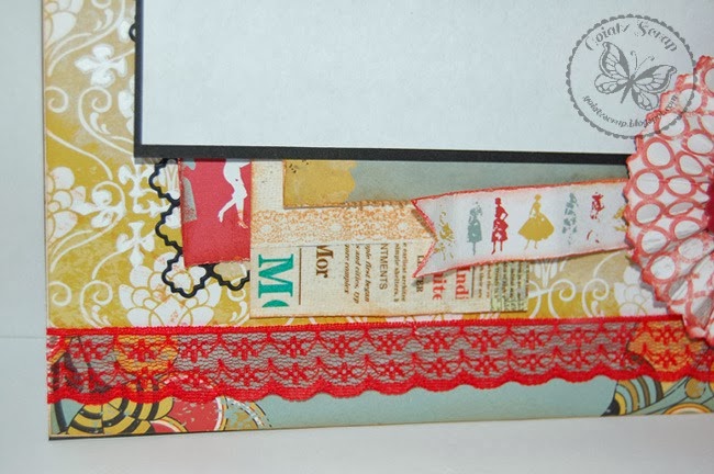 Al papel de fondo (de nombre Swag Flower) se le ha añadido en la parte baja un trozo del papel Litlle Ladies "uniéndolos" con una puntilla roja.