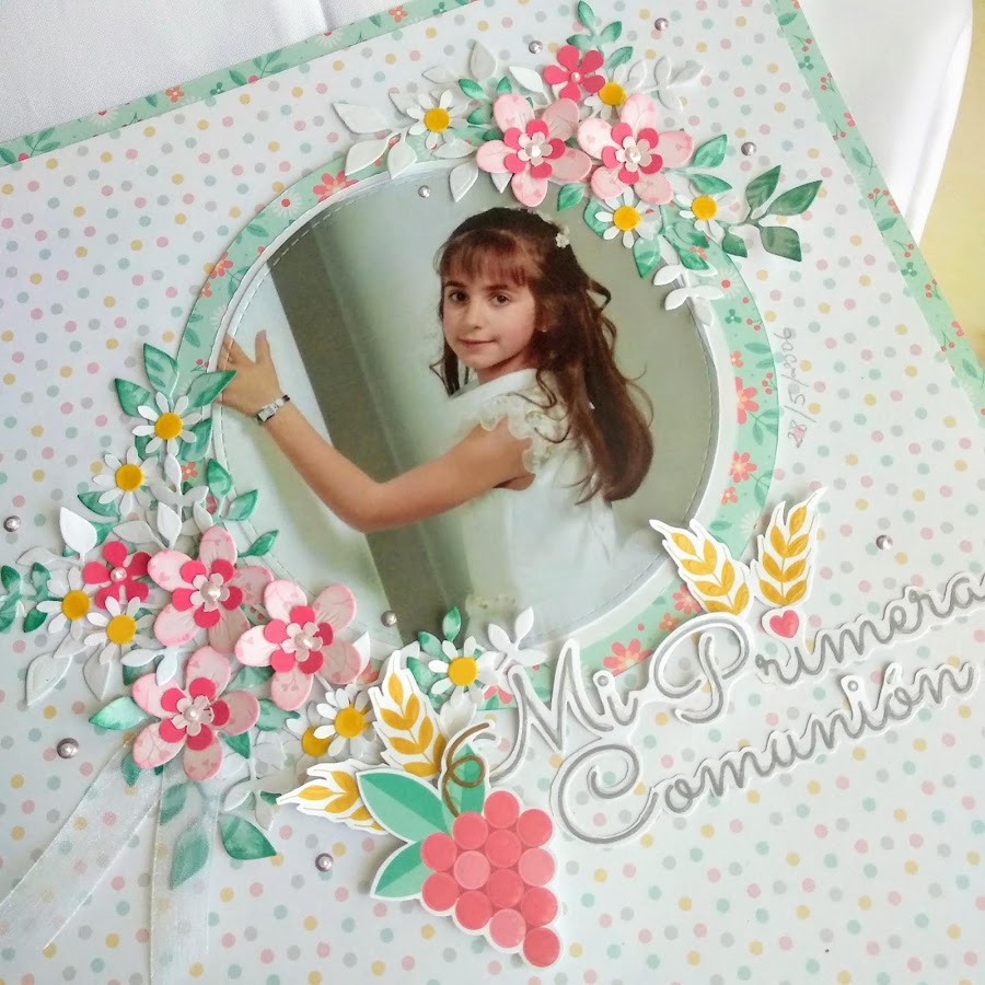 Una composición en diagonal con fotografía en forma de círculo, en este caso con una de las colecciones más dulces y bonitas de Anita, "Primera Comunión Niña"