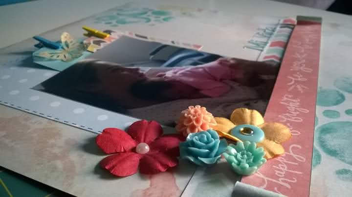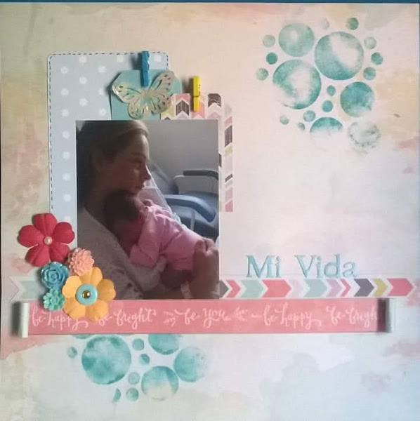 Cuando eres madre te llenas de ternura al tener a tu bebé en brazos, este Layout me salió sólo, fue todo rodado, la foto es la que me inspiró para elegir colores, adornos, colores.......Me encanta el resultado, las flores de resina me apasionaban en ese momento.