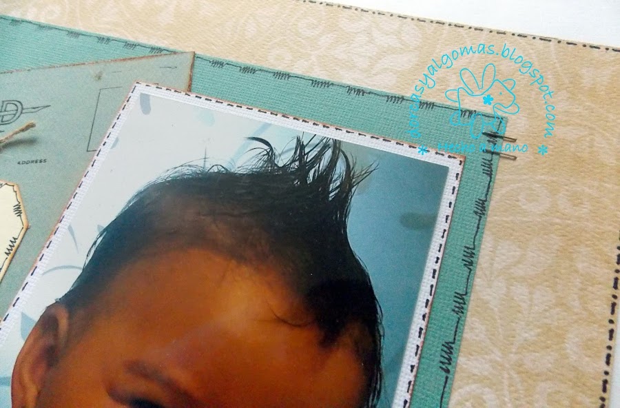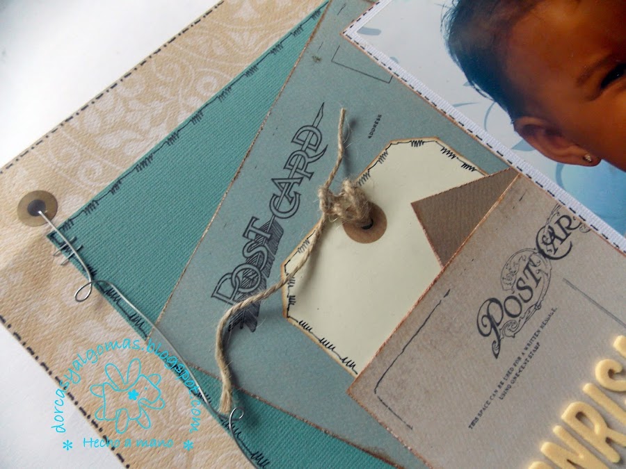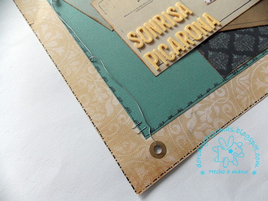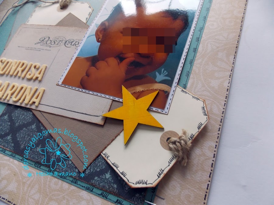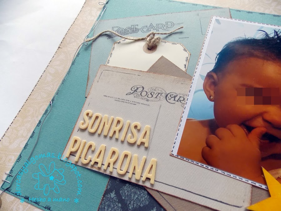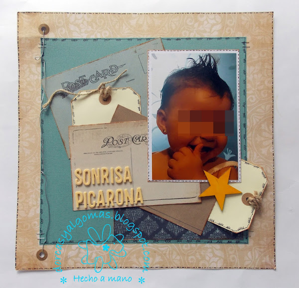 Hoy os muestro un layout que he realizado para mi nieta Alejandra. Tenía una fotografía con su sonrisa picarona y la utilicé en el taller que Patricia Martínez Azkar dió en Ponferrada.