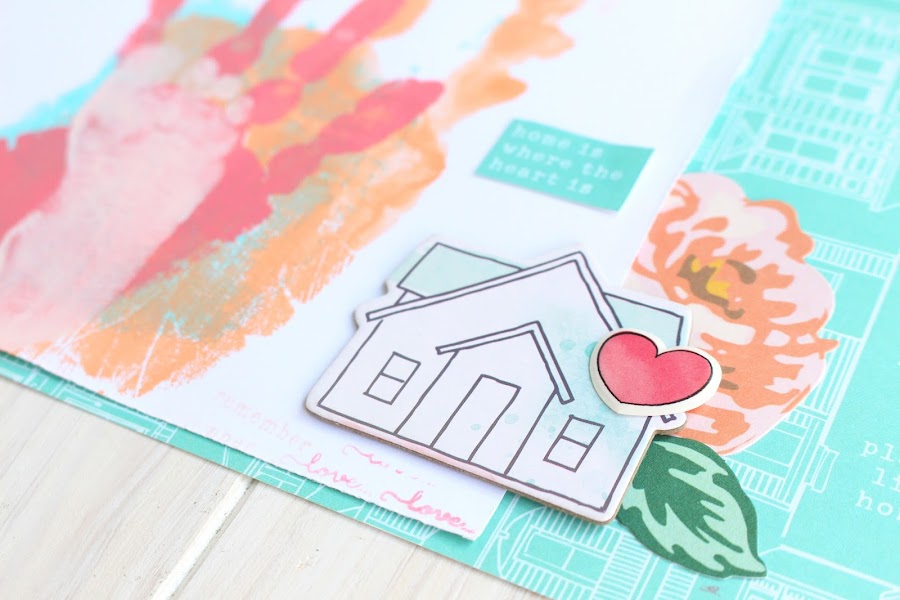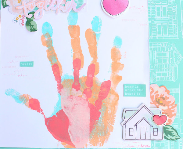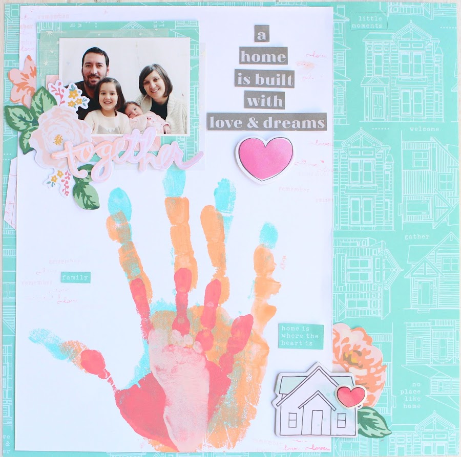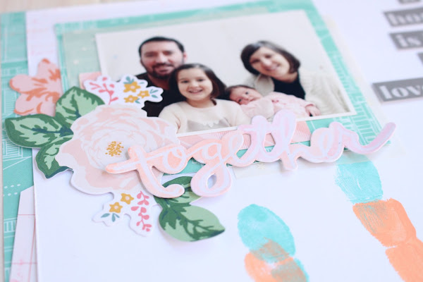 En pinterest vi un cuadro con unas huellas superpuestas y quise hacer mi versión scrapera haciendo una lámina, donde predominaran colores alegres. El papel de scrap que he utilizado es de una colección antigua de American Crafts, 5frolic, las flores son die cuts de Maggie Holmes y la palabra together un die cut acuareable de Heidi Swapp.