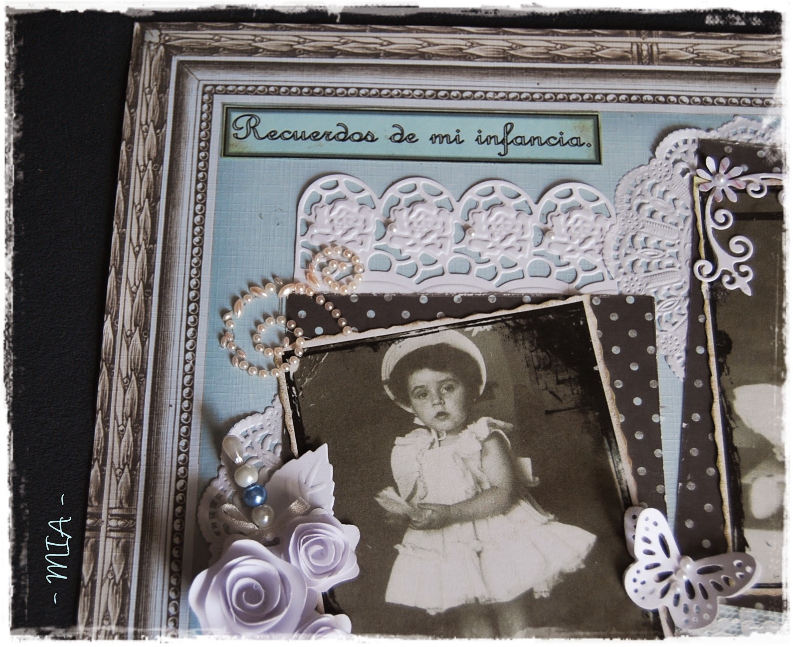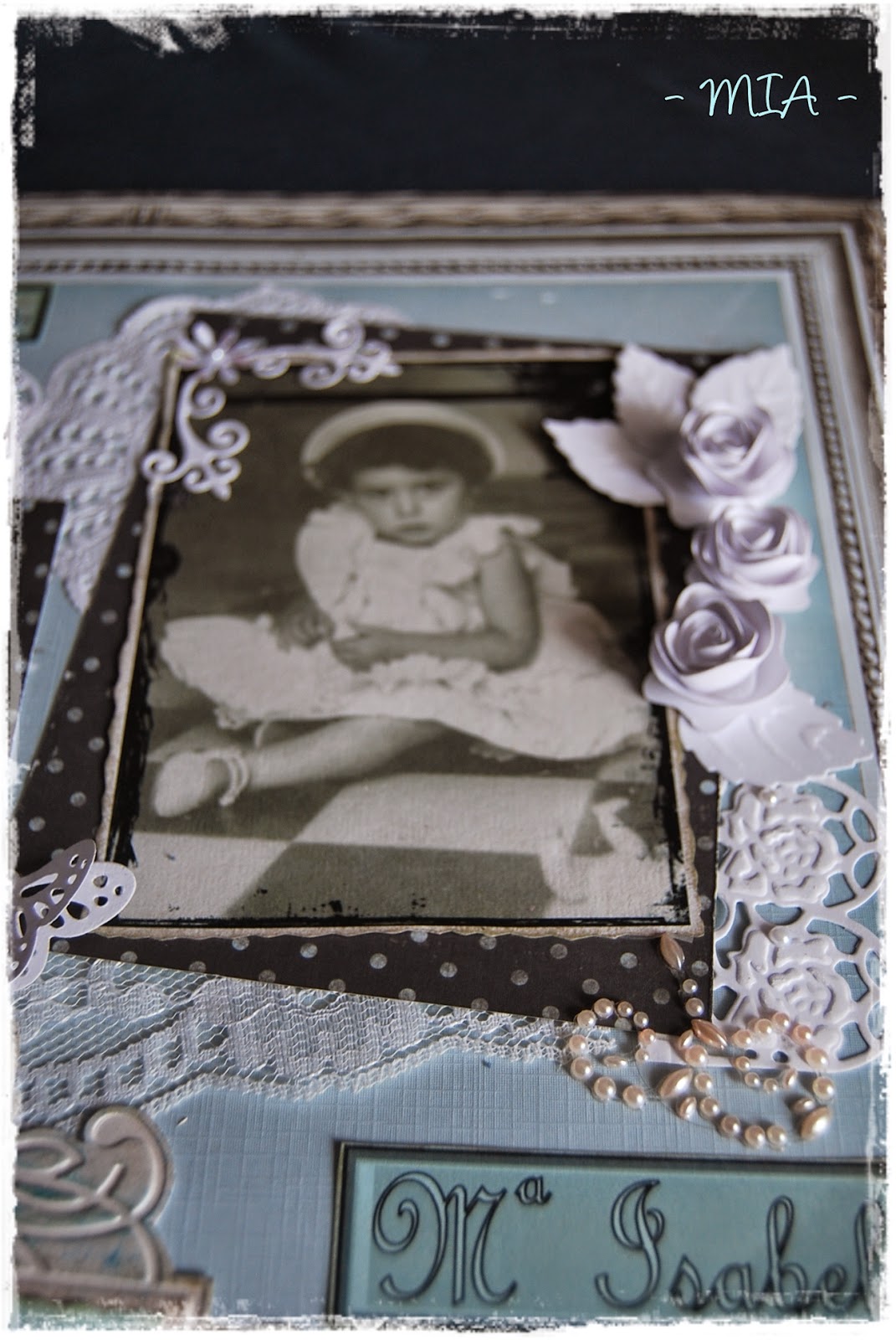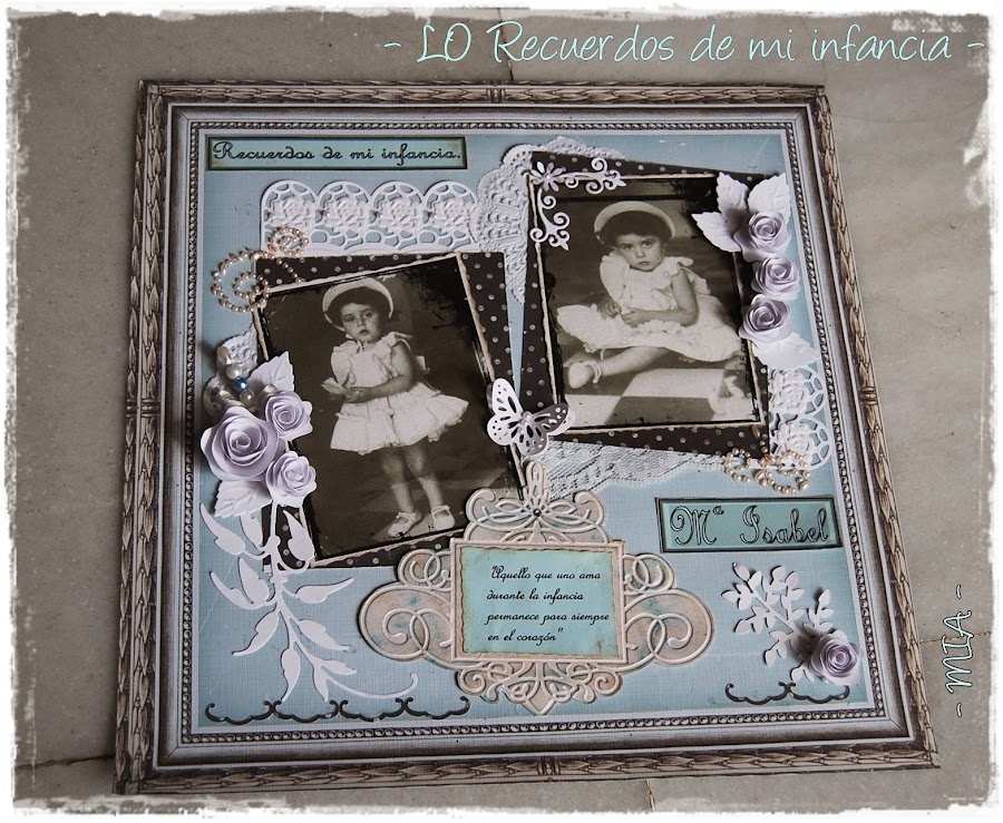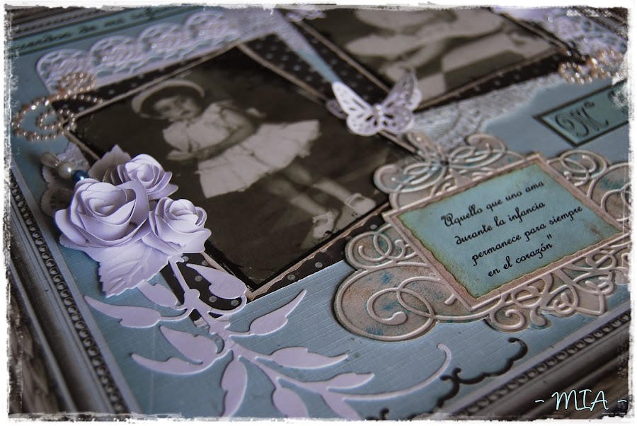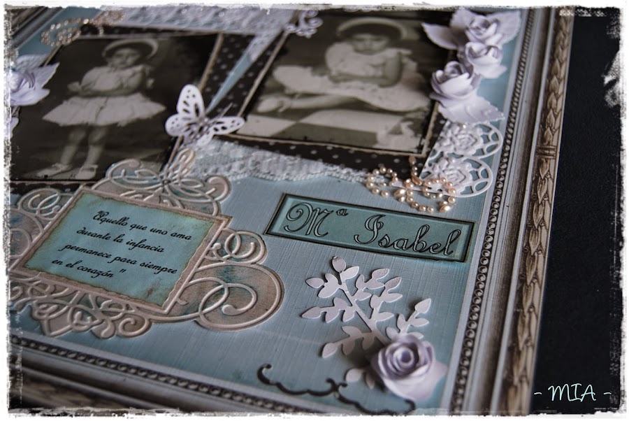 Todos los troqueles y adornos son blancos para dejar el protagonismo a las fotos. El alfiler es casero, al igual que las flores... Espero que os guste...