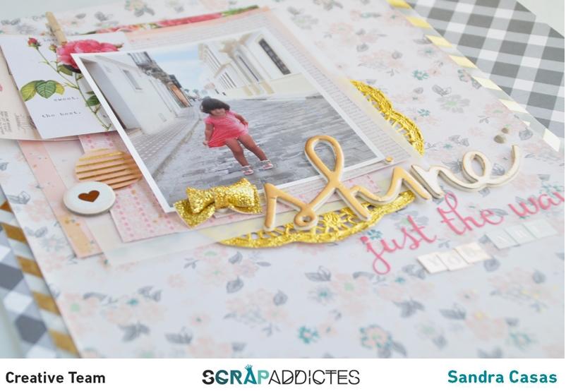 Tenía esta foto de la peque medio taconeando con su vestido rosa un día que fuimos a Tarifa, y tenía que scrapearla. Lo genial de la foto, que por cierto está hecha con el móvil, es que no hay más colores que el rosa, gris, crema y neutros, así que pensé que iría genial en esta lámina.