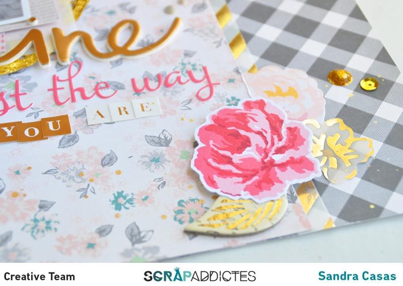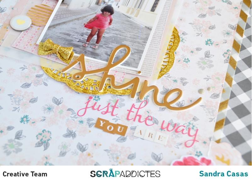 El título significa "Brillas tal y como eres" y por eso he introducido elementos decorativos dorados como el vellum, el título, lazo de purpurina, blonda y chipboards.