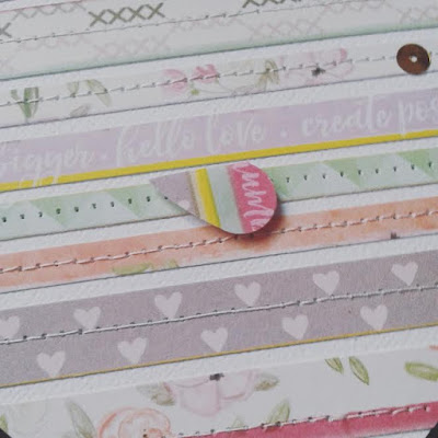 Todas las tiras de papel estan cortadas una a una y dispuestas en diagonal de tal manera que quede entre ellas un hueco libro más el hueco grande central. Posteriormente las cosí a máquina: algunas con hilo y otras sin él para diferenciarlas y darles a cada una su toque. Además le añadí lentejuelas doradas, manchitas de tinta negra, botones y una mitad de corazón a cada lado de las franjas de los dos extremos.