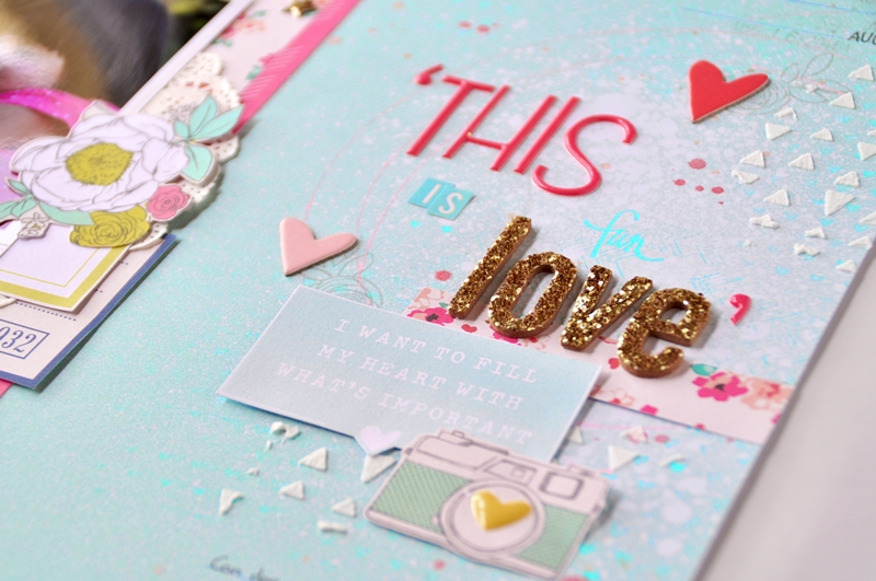 Yo con la mejor modelo del mundo, un momento nuestro digno de ser scrapeado y el título "This is love" (esto es amor!) en diferentes abecedarios. Etiquetas, adornos, salpicaduras con spray, máscaras y boligrafo gel souffle.