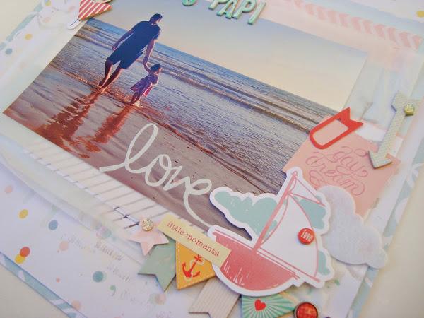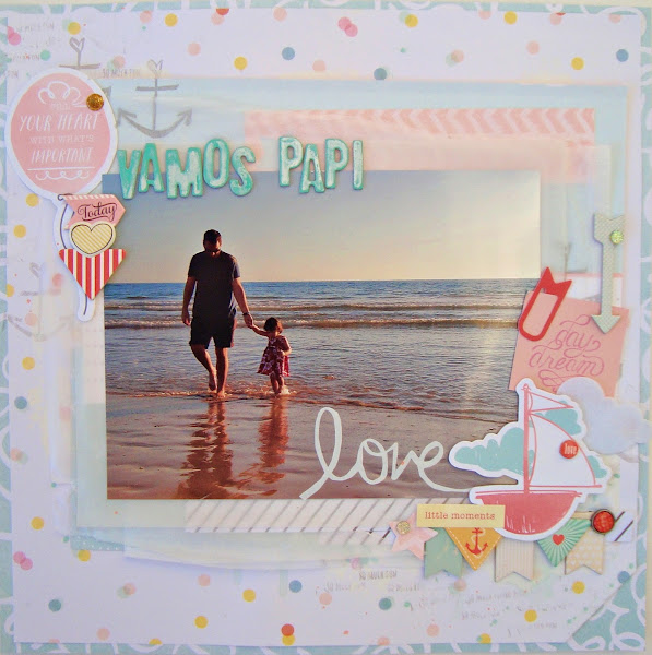 Hoy traigo una lámina un poco diferente en cuánto al formato y a algún que otro elemento que he incorporado. Hacía tiempo que quería scrapear esta fotografía, pero con el tamaño 10x15 me parecía que se perdían demasiado los protagonistas. Así que decidí ampliarla! Lo bueno de que la foto sea grande es que queda menos espacio que decorar y lo malo es que es difícil no caer en recargarlo demasiado. Por ello finalmente opté por hacer capas con papeles de scrap de la colección Daydreamer de Dear Lizzy, e incorporando una novedad, papel cebolla blanco que diera textura y suavizara los tonos del papel.