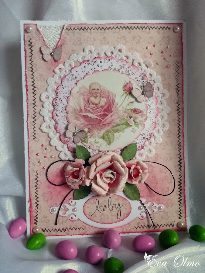 El papel del fondo es de la colección "Sweet Baby" de Pion Design, concretamente "Borders". Las rosas están realizadas también con el mismo papel.