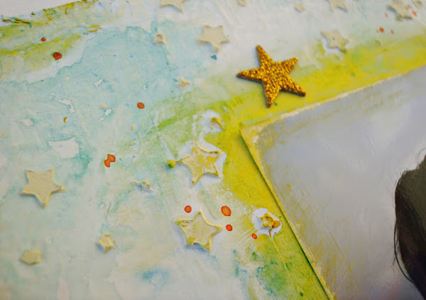 Para realizarla pues un poco de guarreo, gesso, tintas, y pasta de modelar. Me encanta ese efecto de la tinta que parece como espuma de mar, azules y amarillos, mar y sol.