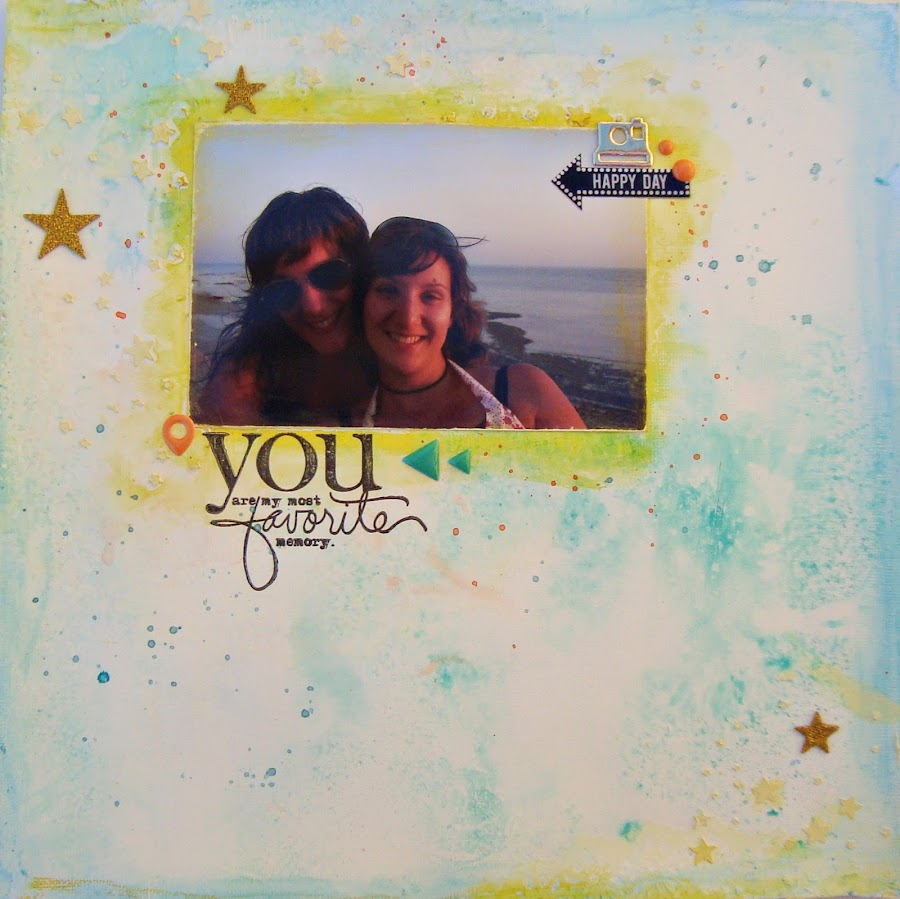 Así que hoy he decidido enseñar una lámina, muy rara en mi, ya que no tiene papeles, ni casí adornos. Yo la llamo terapéutica, porque el scrap también tiene esa parte, de crear, evadirte, y sentirte bien simplemente por el hecho de estar haciendo algo que te gusta. Un trabajo que igual enseñas o igual te guardas para ti. En este caso una fotografía, yo y mi hermana, en el atardecer de Cádiz.