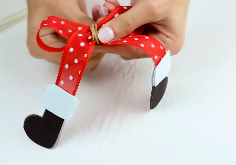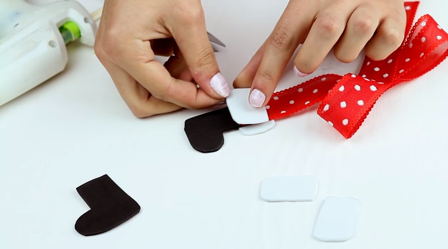 2. A continuación, la goma eva se recortará en forma de botitas. Estos accesorios se pegaran a los extremos del lazo.