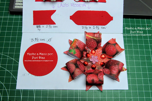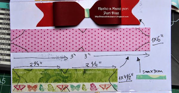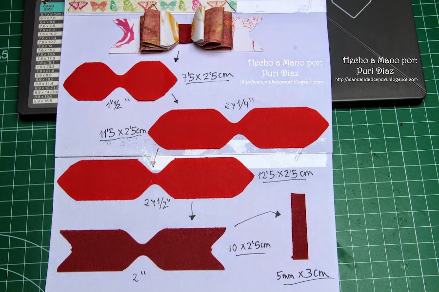 Aqui os dejo las medidas de los lazos...los lazos podéis hacerlos con cualquier medida...solo tenéis que hayar el centro y a partir de ahí hacéis los troquelados tal cual os digo yo en el vídeo-tutorial.