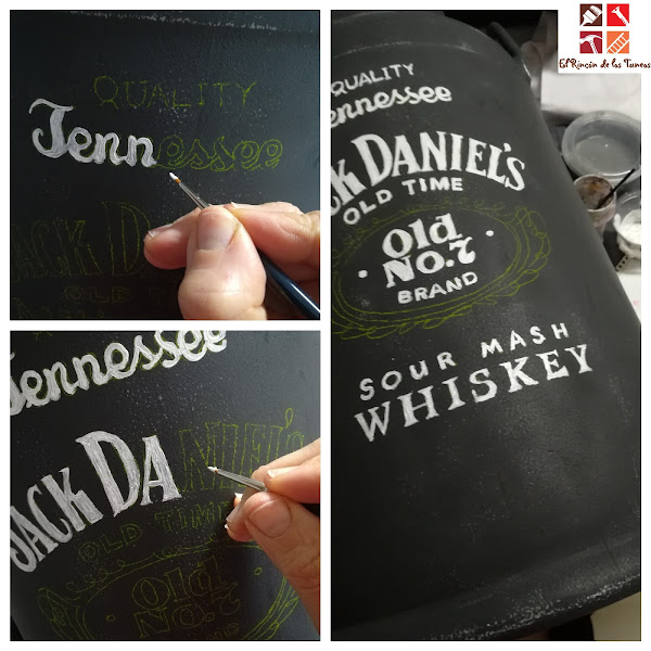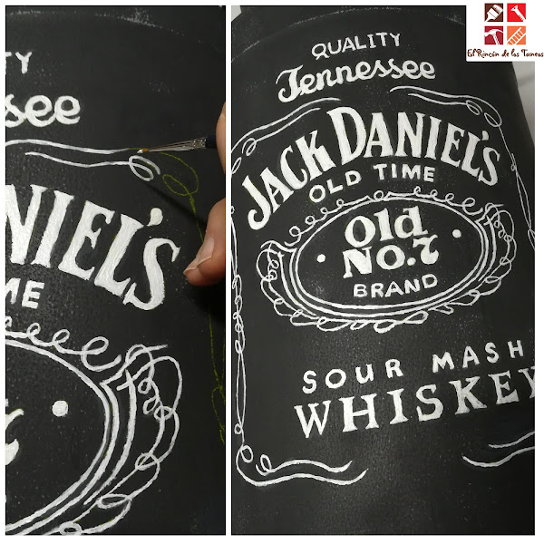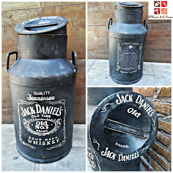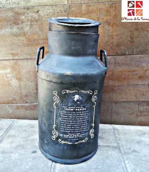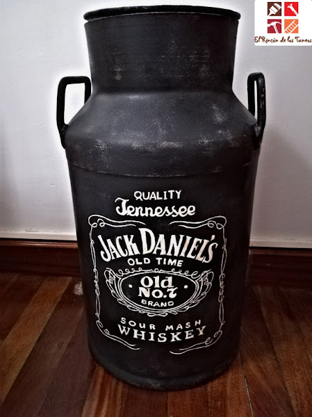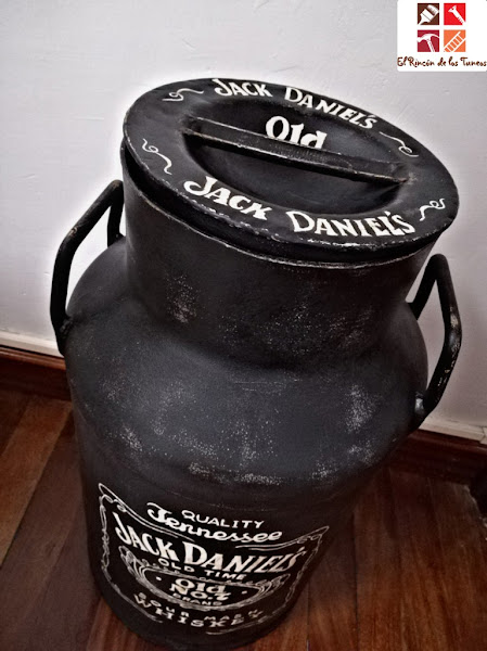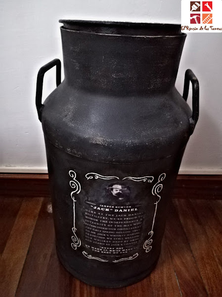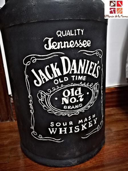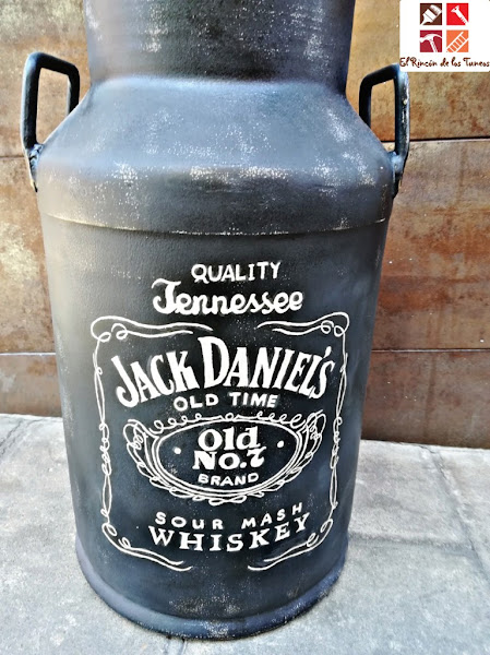 Pero a lo que íbamos, esta vez su gusto era pintar una lechera que había comprado con el motivo de la botella de Jack Daniel´s, la marca de Whisky tan característica por su color negro, y como siempre, la única condición que me puso era hacerla con su sello, le gustan las piezas con un efecto vintage, desgastado o añejo .