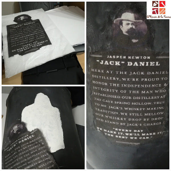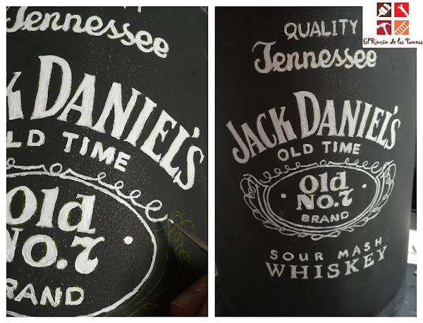 Para hacer las letras de la marca de Jack Daniels , lo que hice fue imprimir en papel en un tamaño grande las letras e imágenes y copiado en papel cebolla para calcarlo en la lechera.