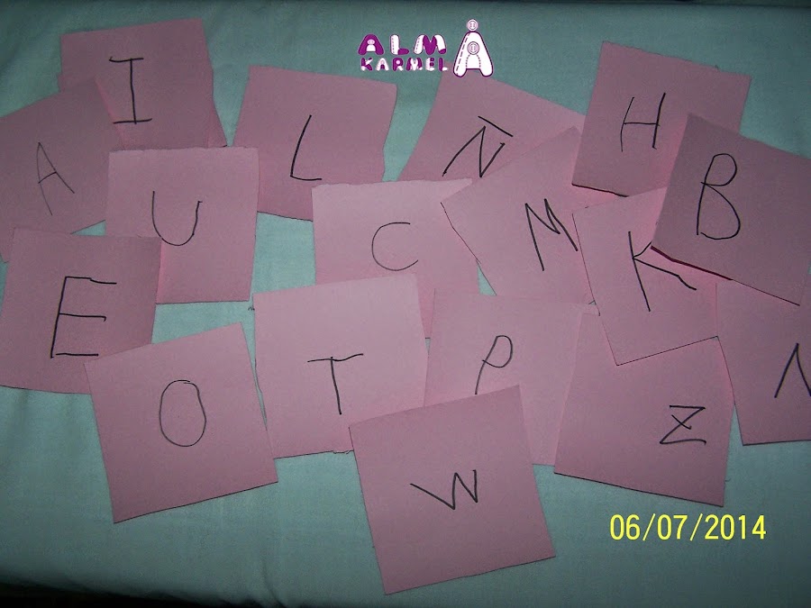 Luego pasamos a recortar los cuadraditos, lo que le sirvió para practicar con la tijera, y por último con un rotulador negro, escribió ella todas las vocales y consonantes, como podréis apreciar.