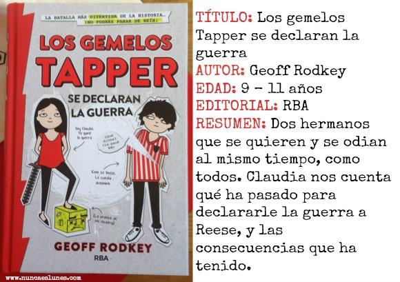 Esta vez, añado una sorpresa, desde Boolino te invitan al sorteo de 20 packs de este libro que incluyen lo que ves en la primera foto: una bolsa de tela, dos chapas, el libro de los Gemelos Tapper, y un cartel para la puerta reversible.