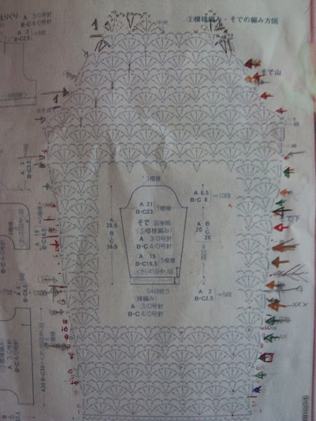 Y el patrón o croquis o como se llame los símbolos de ganchillo, lo saqué de aquí. Es una manga de una chaquetilla de niña que encontré en san pinterest. La verdad no sé ni como me aclaré, pero como querer es poder y una que es cabezota hasta la médula, no se me iba a resistir.