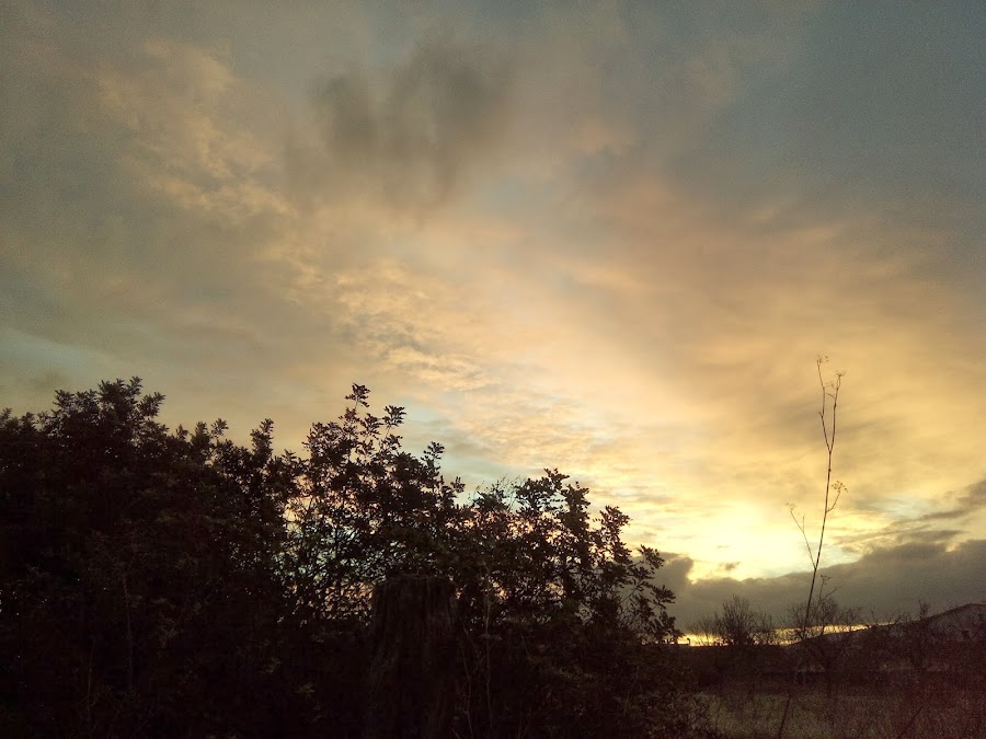 Cuando me he levantado esta mañana le he hecho esta foto al cielo porque me gustaban esas nubes que dejaban ver esos tonos celestes al fondo. Pensando que cuando saliese el sol me haría las fotos, pues ni sol, ni tonos celestes, ni na de na. Se ha encapotado más y no para de llover. Así que sigo con fotos dentro de casa, con el móvil (no encuentro la cámara) y así han quedado, de pena.