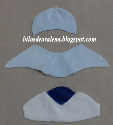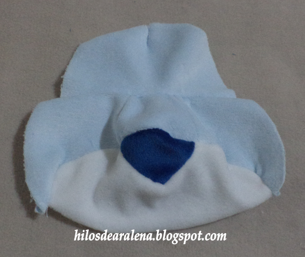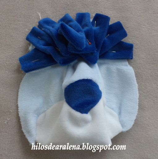 Fijense que la frente lleva una pequeña pinza , el centro consta de tres partes y en la parte inferior colocamos el triangulo de la nariz.