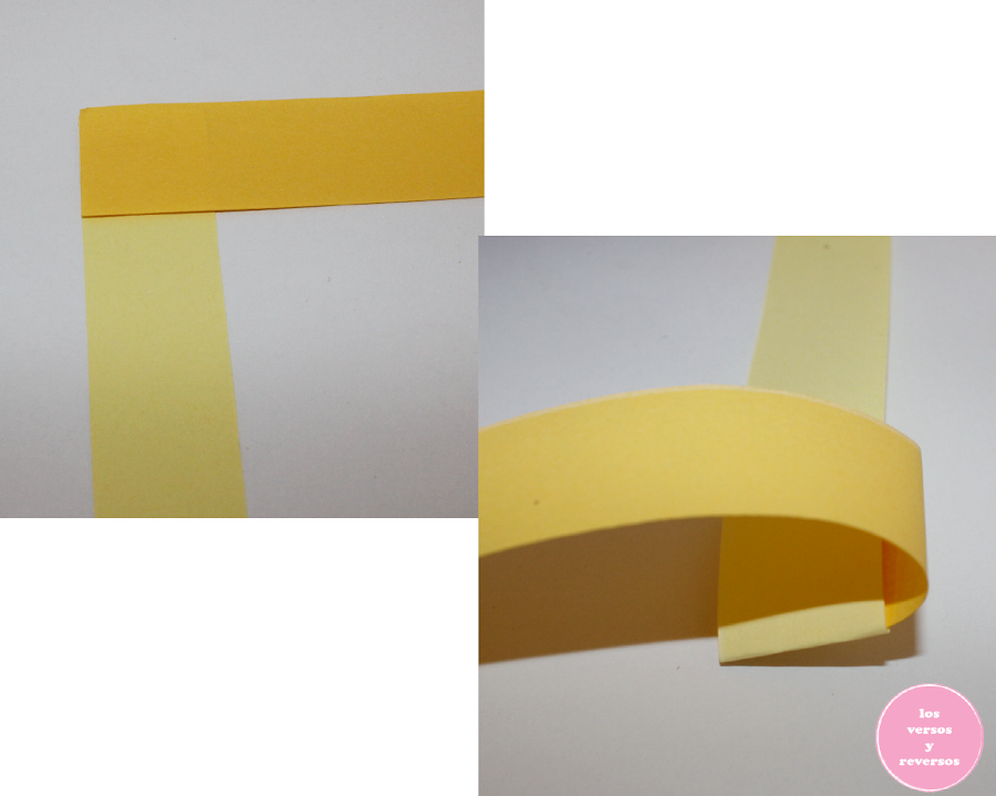 Lo primero que hice, fue cortar dos tiras de papel de 2 centímetros de ancho del papel amarillo claro a lo largo de la hoja carta y lo mismo, del papel amarillo más fuerte.