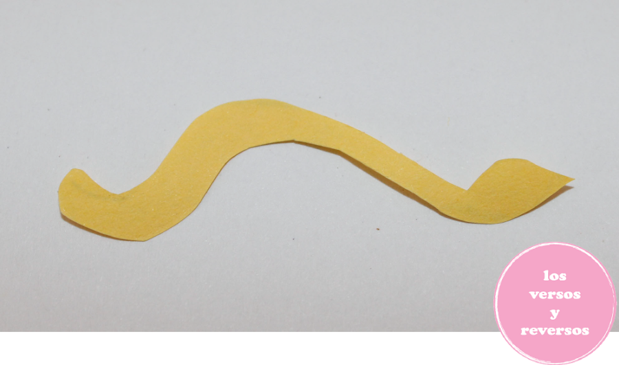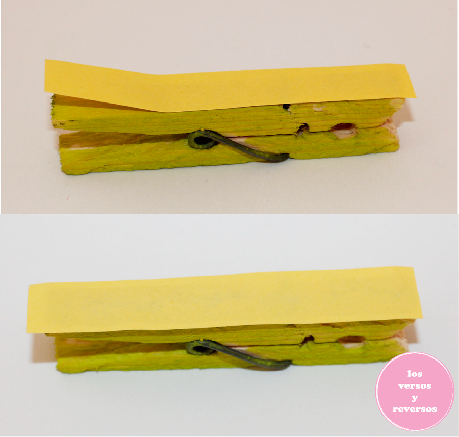 Hice con las tijeras en el papel amarillo una colita (sin molde) y se la puse en el extremo de la pinza.