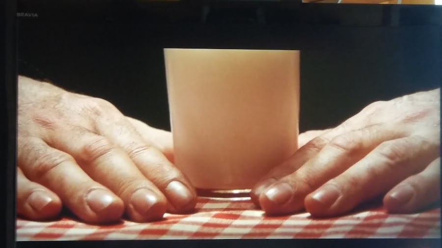 agotado del día, se ducha, se relaja y toma su vaso de leche