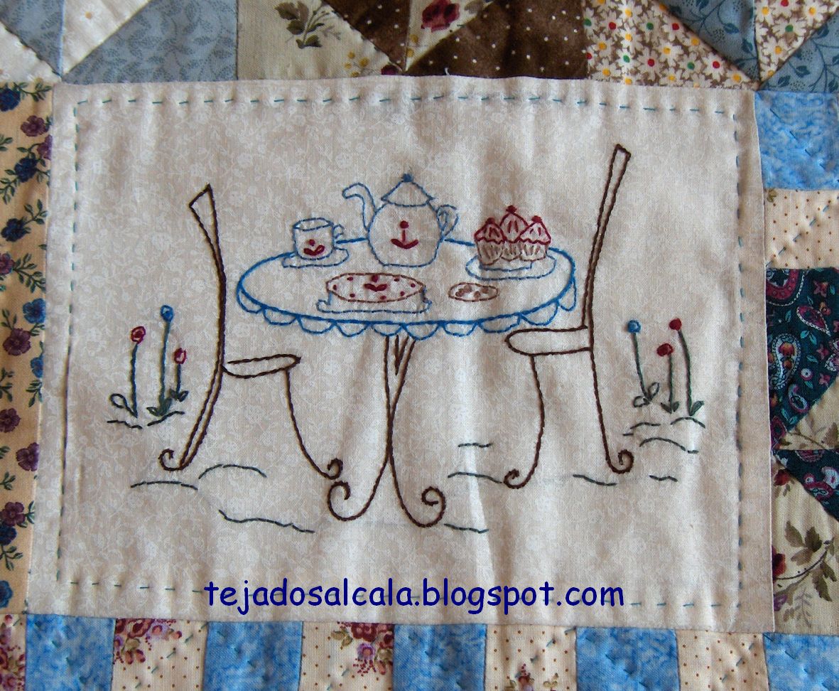 Mi último trabajo ha sido un camino de mesa con un pequeño tapete haciendo juego. La base son hexágonos en tonos azules y sobre éstos, centrados, otros hexágonos más pequeños en blanco. El acolch ...