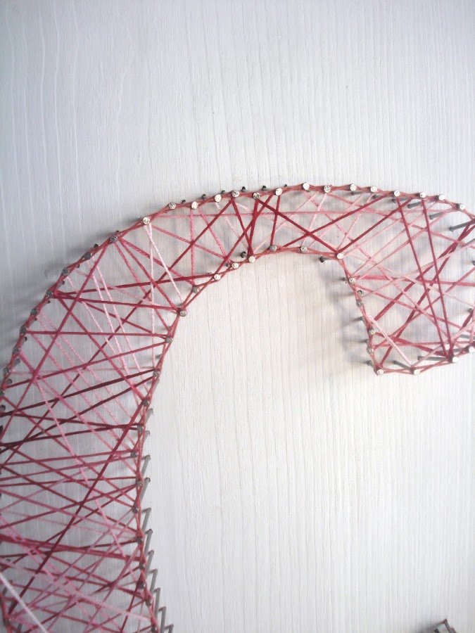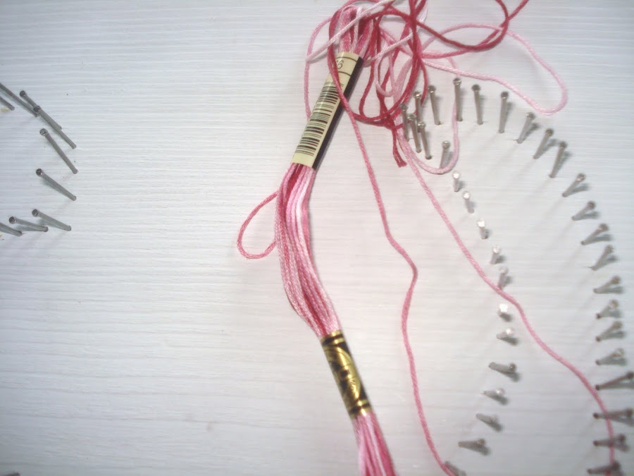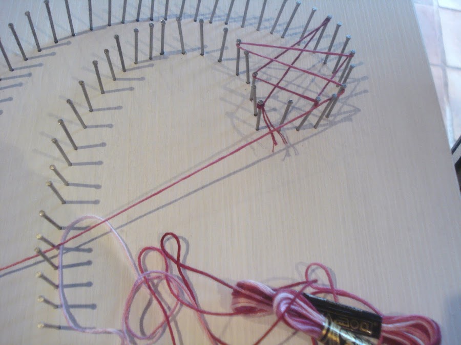 Se anuda el hilo a un clavo y se pasa por los diferentes clavos.