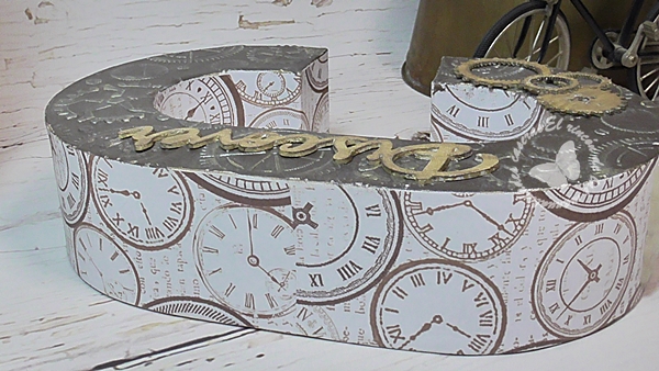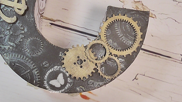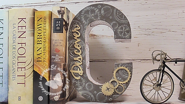 En el frontal de la letra le he aplicado pasta de relieve con una plantilla de engranajes, con una poca pintura y otras piezas en madera tengo una decoración estilo steam punk.
