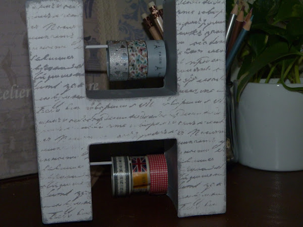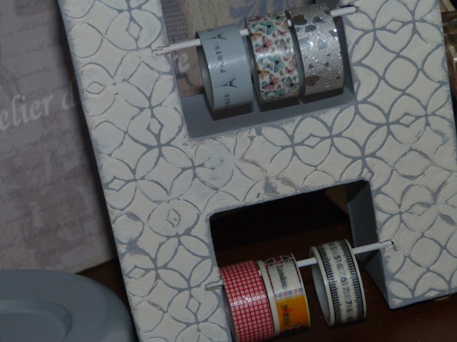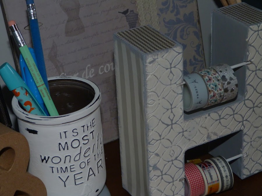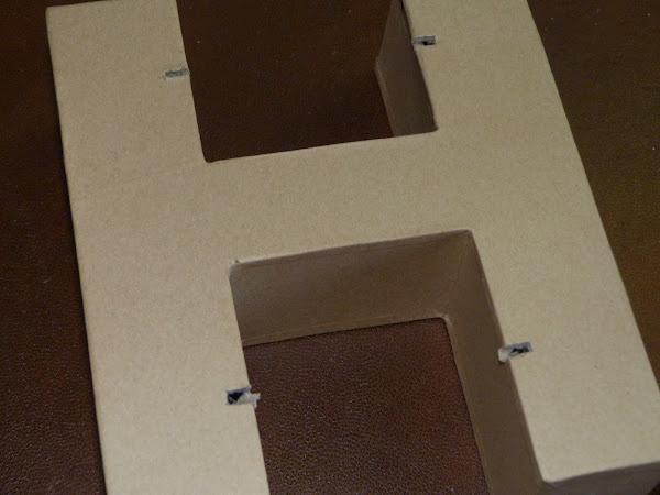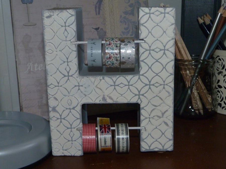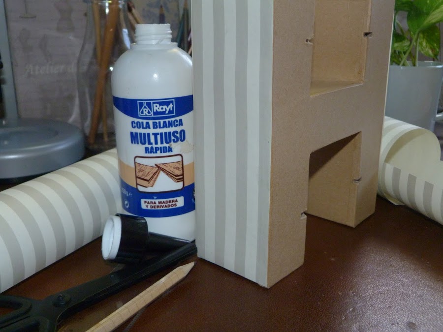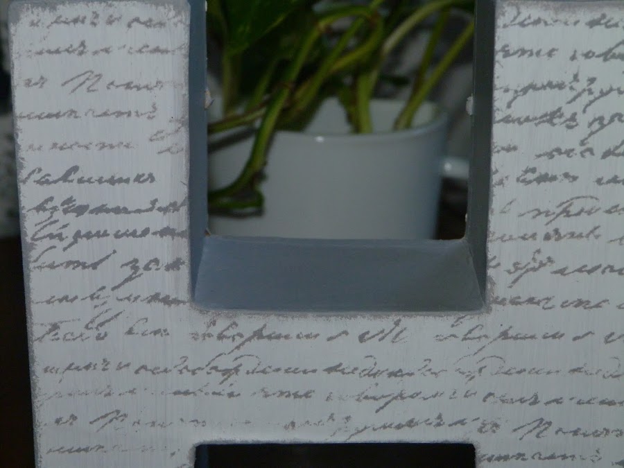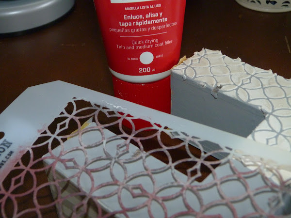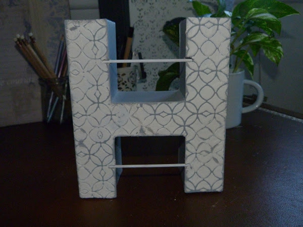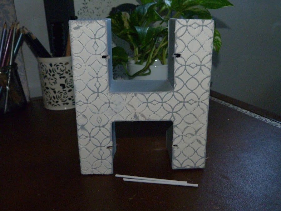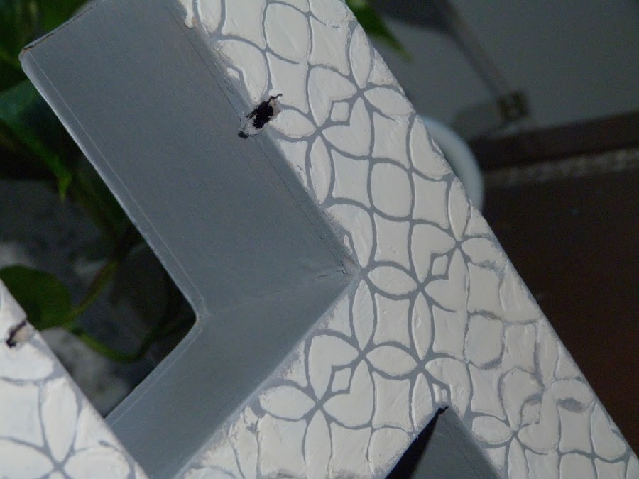 Pinté una de las caras de la letra en color gris medio, haciendo después un estarcido con relieve pero de forma muy irregular. Como la plantilla era más pequeña que la letra y tuve que trabajar por partes, en cada una de ellas puse distinta cantidad de aguaplast, de forma que quedara mucho más desgastado por unas que por otras, con un efecto como "descascarillado". Yo siempre haciendo que todo parezca viejo jajaja.