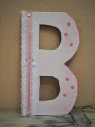 Quería que fuese estilo vintage (no sé si lo conseguí), pues recorté la letra de cartón, pegué la goma eva blanca, le pasé colorete rosa para romper un poco el color blanco, le puse puntilla blanca, cinta rosita, 2 botones blancos, un lacito y estrellitas rosa. Y como no quería recargarla más la dejé tal cual. Me gusta como quedó.