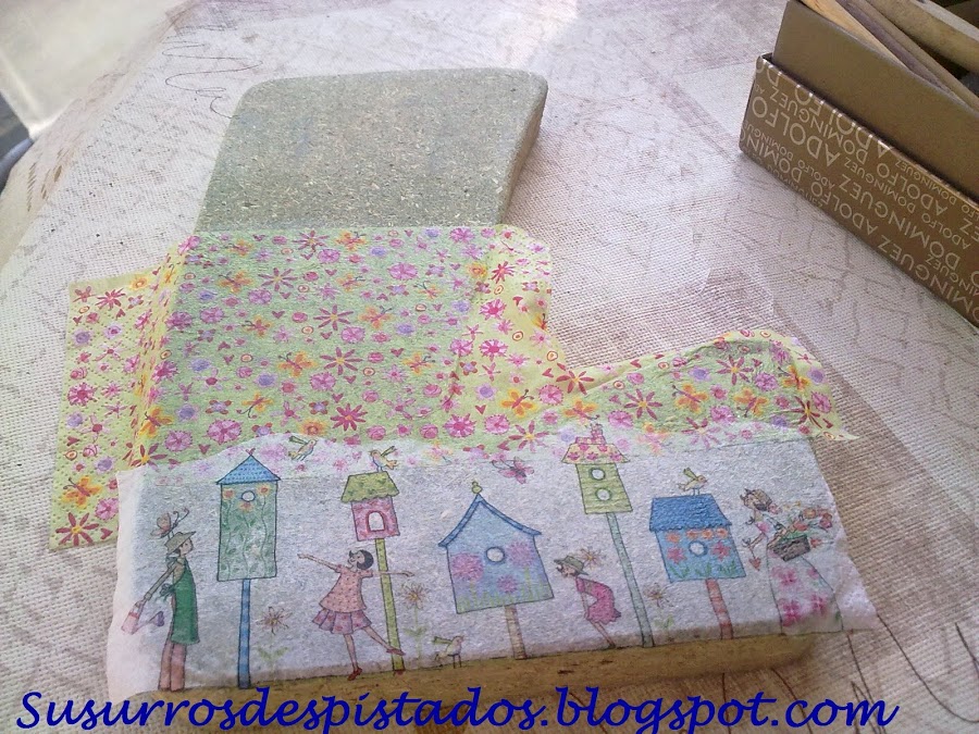 Vamos con los materiales necesarios: trozo de contrachapado o madera de un grosor de 1-2 cms, servilleta decorada, cola blanca, pinceles, papel carbón, sierra de calar, lija, tijeras, lápiz, papel, pistola de silicona, pintura acrílica, barniz y algún trocito de lazo o botón o fornitura para decorar.