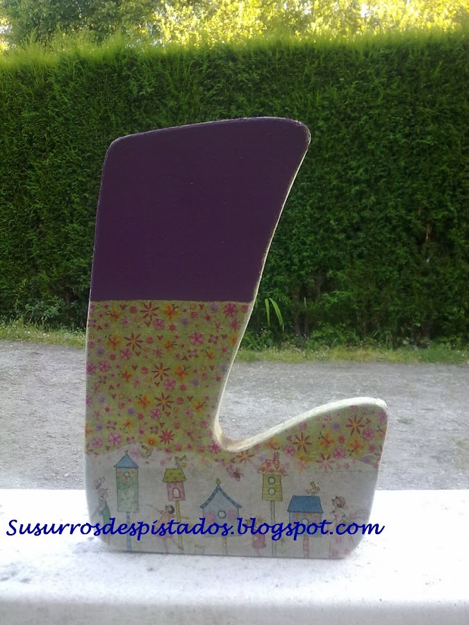 Para la tercera parte de la letra hemos optado por pintar en un tono malva ya que después sobrepondremos una florecita que también hemos cortado de un trocito de madera (huelga decir que la parte de atrás de la letra también va pintada del mismo color )