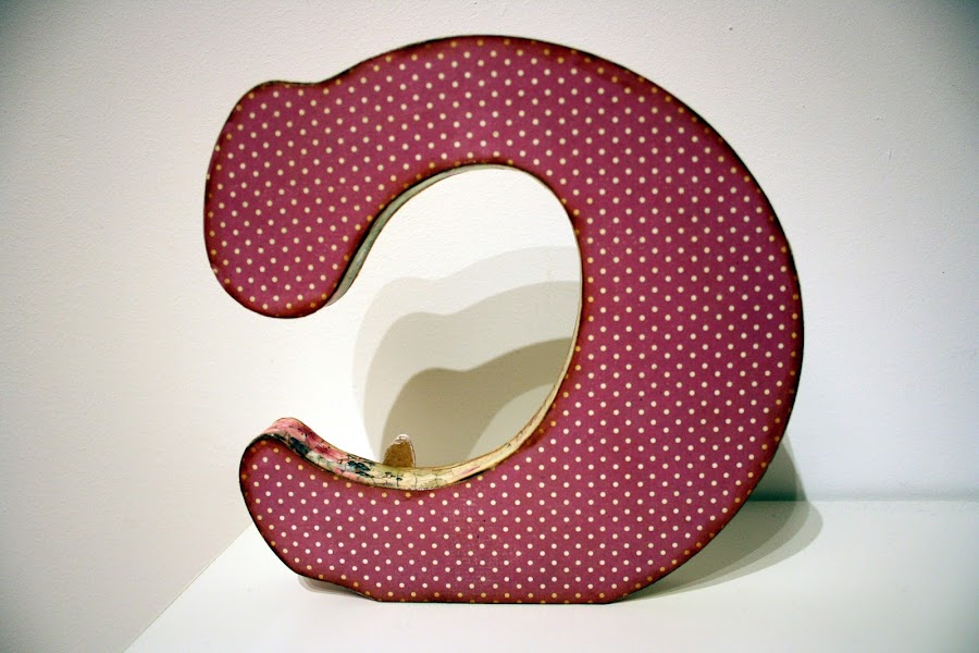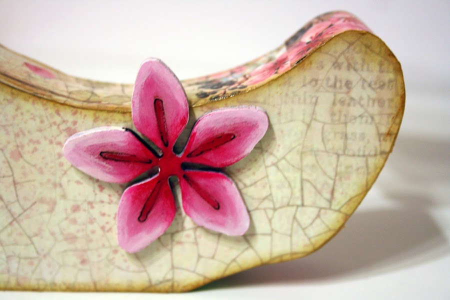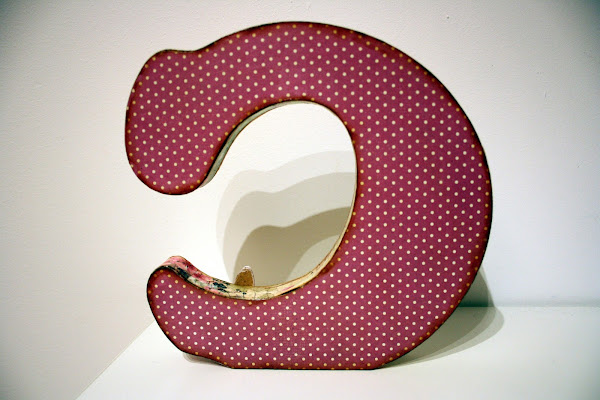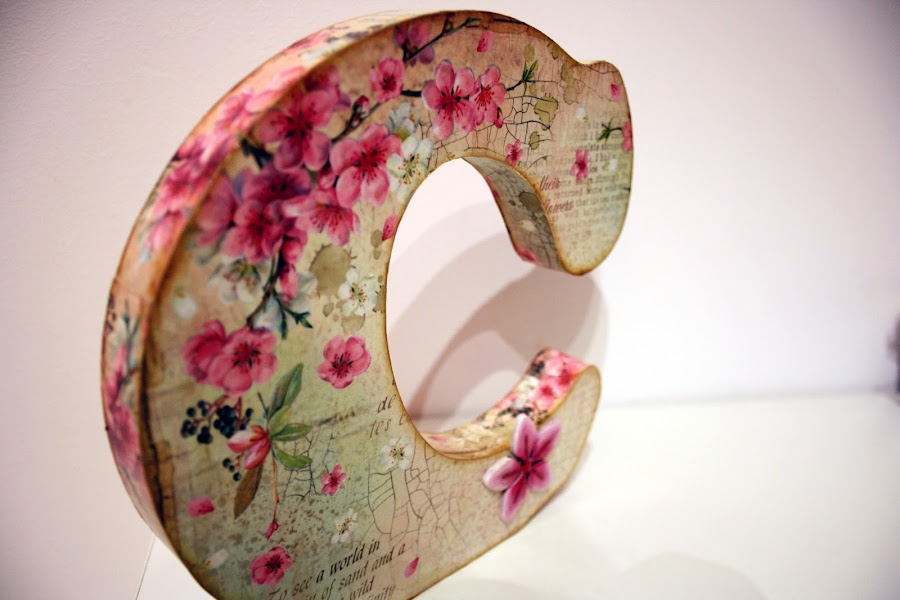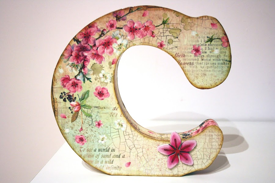 En la parte frontal de la letra he utilizado un papel de stamperia de cerezos y a modo de detalle y pintada a mano una figura de madera en forma de flor de cerezo. Por la parte de atrás utilicé un papel lila con topos blancos a juego con los colores del papel frontal. En los bordes he utilizado el mismo papel del frontal intentado que coincidieran las flores a modo de continuación del dibujo y por último usé la tinta distress vintage photo para envejecer los bordes y darle profundidad a la letra.