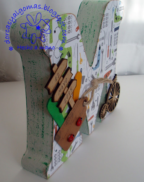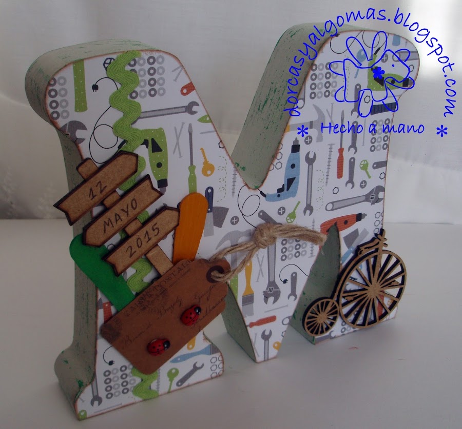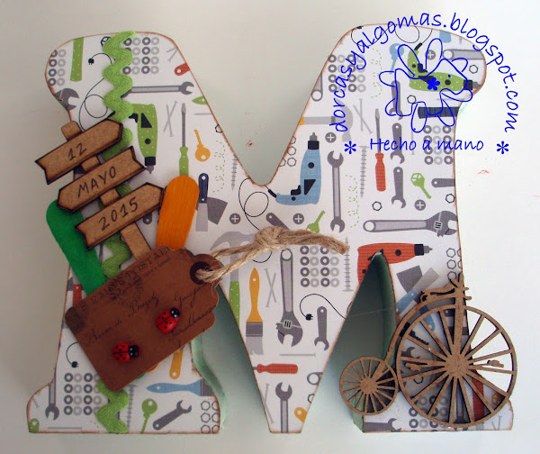 Hoy os traigo una letra de madera decorada. Se trata de la letra "M" que hice para mi sobrino Marcos.