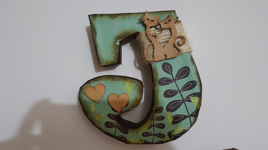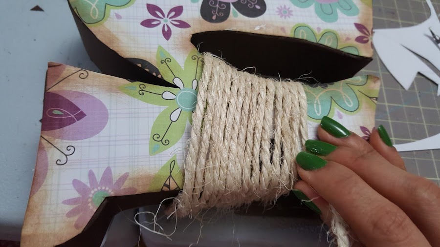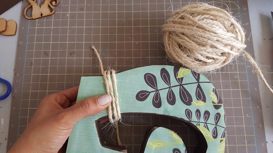 Corté el papel de scrap con la misma forma de la letra, lo pegué y decoré con cuerda y unas flores de goma eva.