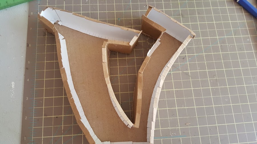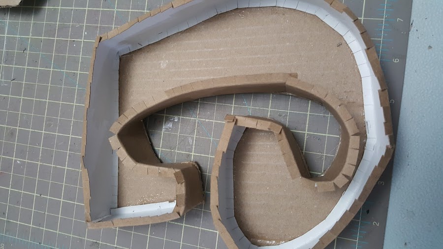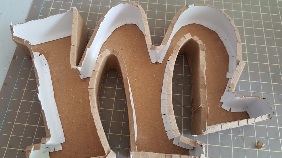 Corté unos listones de 4 cm de alto, para hacer le relieve de cada una de las letras, estás son de un cartón más delgado llamado cartón cartulina. A medio centímetro por lado y lado hice un marca con el bisturí suavemente para poder doblarlo y crear una pestaña que irá adherida a la letra, he hice unos cortes para facilitar el contorno.