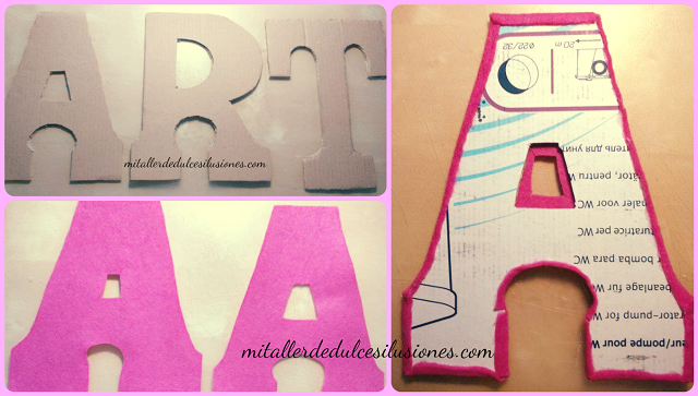 3.Cogéis las letras elegidas, la pasáis a cartón y a fieltro,cuando cortéis las de fieltro,recordar que tenéis que cortar dos ,una para delante y otra para la parte de atrás,la de delante procurar que tenga 1cm más para poder doblarla al pegarla y que no se vea el cartón del borde,luego pegáis la parte de atrás para que tenga un bonito acabado.