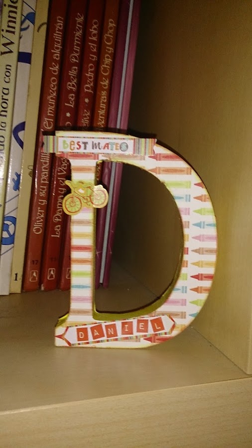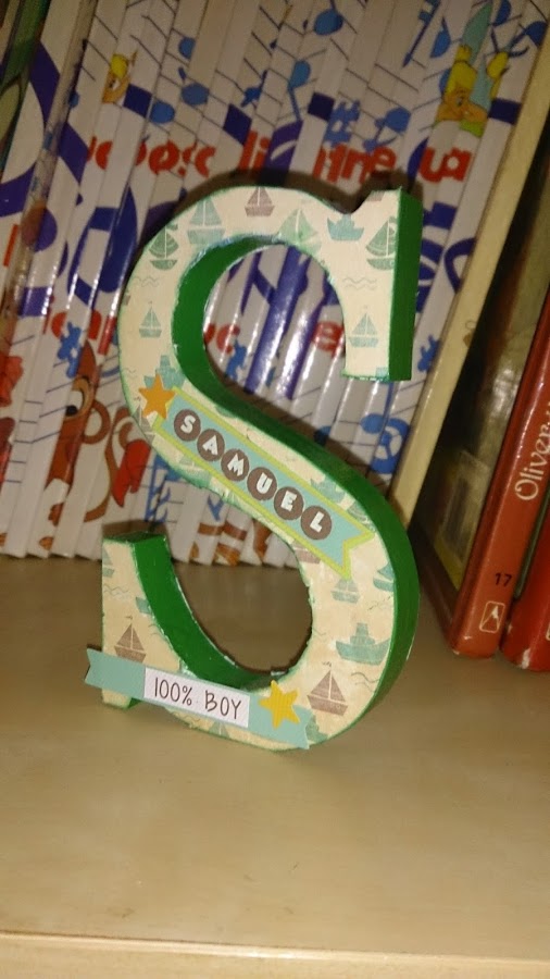 La inicial S de Samuel la pinté en un color verde oscuro que combinara con el papel scrap de barcos que escogí. Y la letra D la pinté en amarillo y combiné con un papel con motivos escolares.