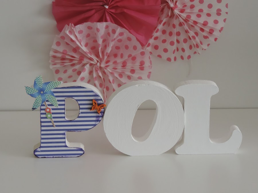 Las iniciales ....las de los niños están hechas con la tecnica de decoupage pero con papel fino para scrap que compré en TIGER y las aplicaciones de el molinillo y la cometa , són recortadas de hojas decoradas con estos motivos....estas de los niños además las envejecí un poco con tinta de los sellos.